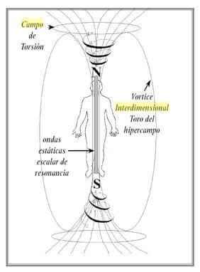 Figura 2.1 Hipercampos corporales. El cuerpo físico está rodeado por hipercampos en un espacio dimensionalmente superior. El toro (*aquí lo llamo Toroide), un vórtice interdimensional, tiene múltiples capas, como la piel de una cebolla. Estos campos energéticos acarrean las propiedades hiperespaciales de los campos de torsión. A través de toda la estructura hay una corriente, o flujo, de energía. Bearden ha calculado que el sistema físico se encuentra en constante intercambio de energía con el vacío (Mar Cósmico) (*aquí lo llamo Orgon). La magnitud de ese intercambio de energía es equivalente a la producción de energía de ¡un millón de centrales generadoras de energía de 1.000 megavatios! Esta es totalmente «Energía Libre».