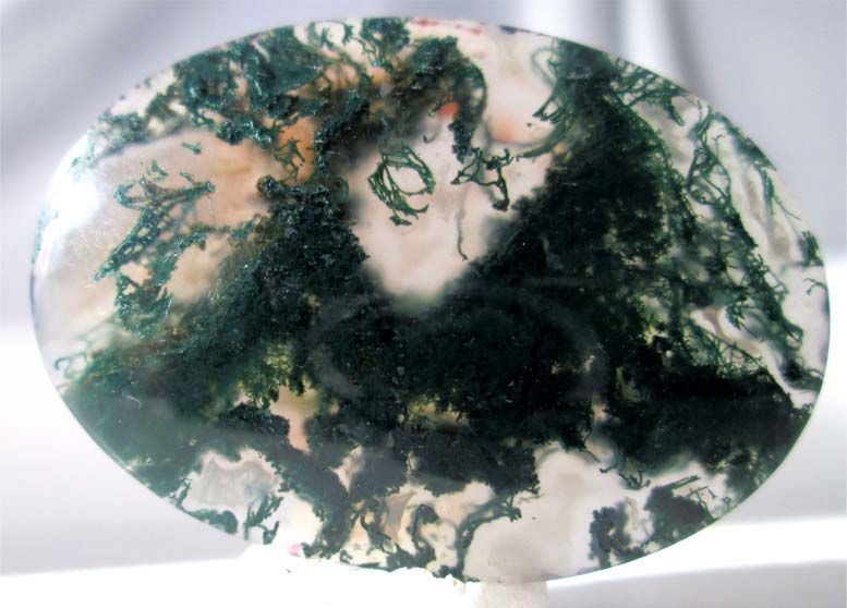 El ágata musgosa se caracteriza por la presencia de «dibujos» naturales que se asemejan a paisajes, que en realidad se parecen a plantas o musgos pero en realidad son inclusiones de clorita.